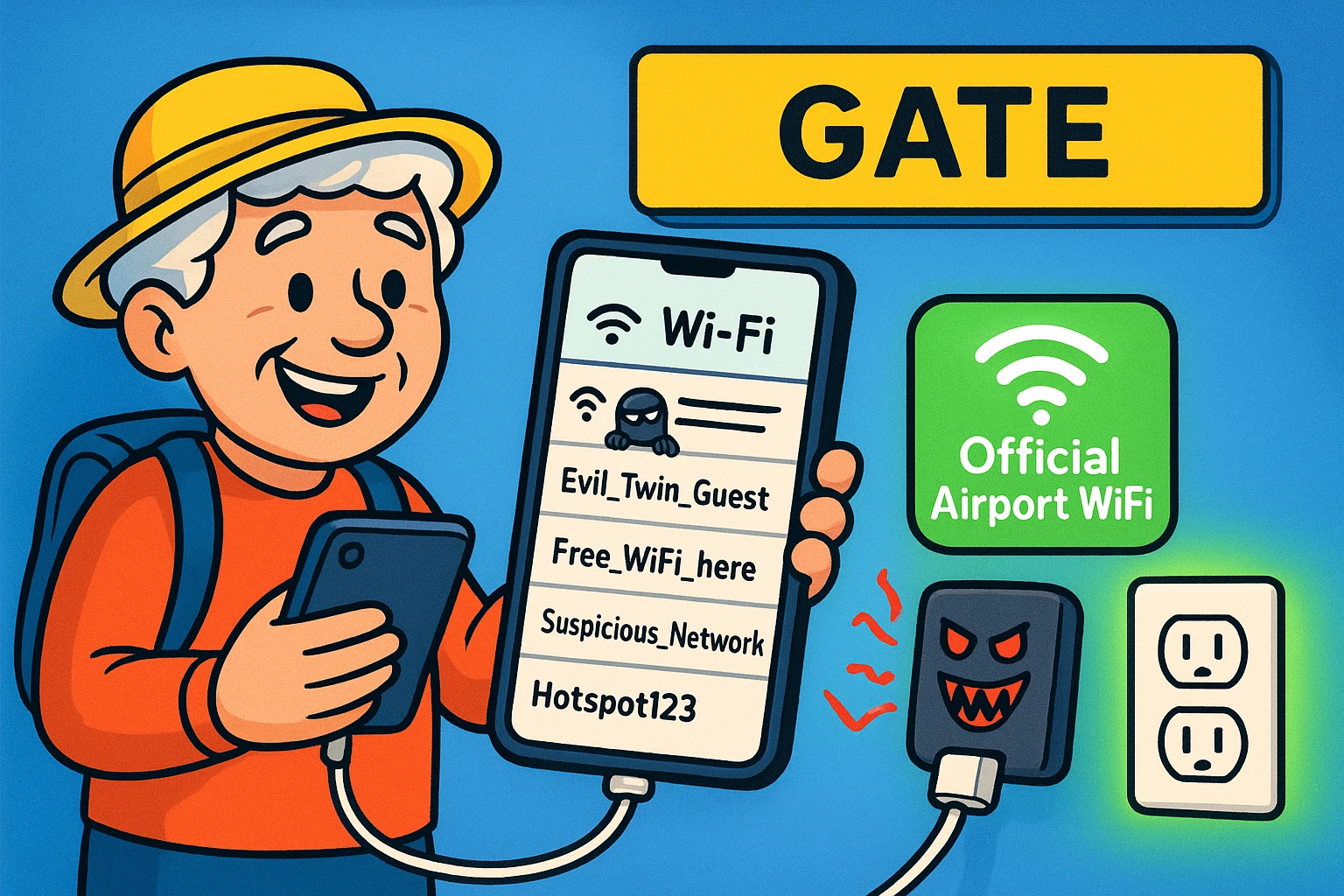 This visual clarifies safe Wi-Fi connection choices, the importance of avoiding USB charging ports, and introduces the VPN as a secure tunnel, simplifying key airport tech safety concepts for seniors.