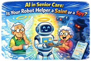 An illustration showing a friendly, simple smart calendar interface with icons for health, family, and reminders, presented as a helpful assistant for seniors.